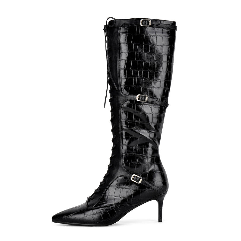Pointed Toe Stone Buckle High Heel Boots